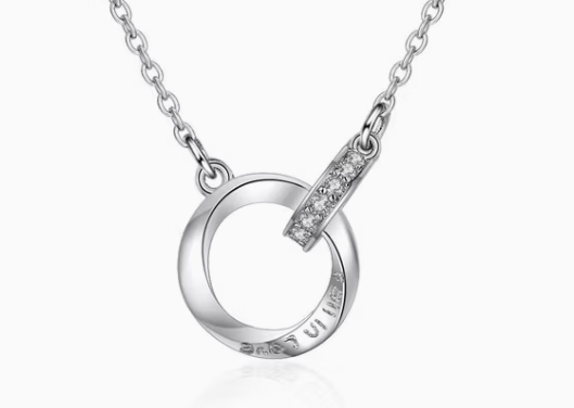 Il ciondolo circolare in argento simboleggia continuità ed equilibrio, mentre il dettaglio verticale impreziosito da piccole pietre luminose aggiunge un tocco di luce raffinata, mai eccessiva.